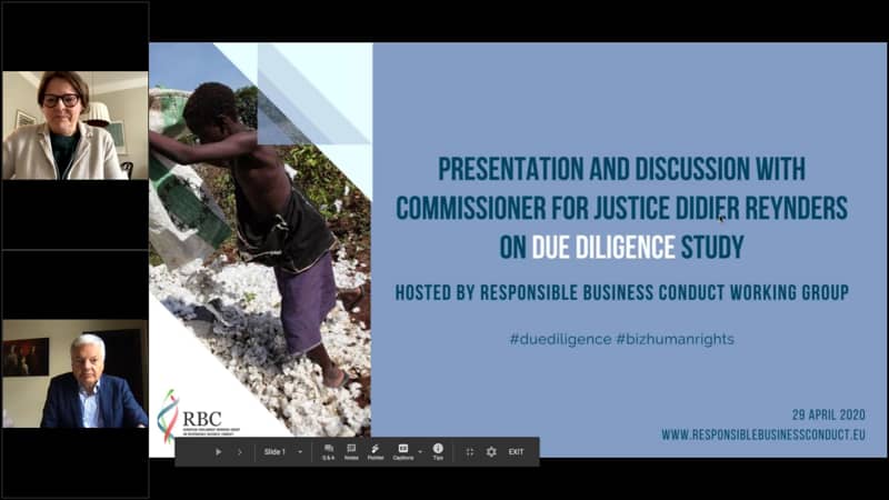 At the end of April 2020 the European Commissioner for Justice Didier Reynders announced during a webinar hosted by the Responsible Business Conduct Working Group of the European Union that the European Commission will be developing legislation making human rights and environmental due diligence mandatory for EU companies from 2021. In April 2020 Didier Reynders the EU Commissioner for Justice announced the European Unions plans to introduce comprehensive legislation on this issue. The EU Justice Commissioner Didier Reynders at a conference organised by the Business Conduct Working Group of the European Parliament announced the launch of a new mandatory Due Diligence regulation on human rights and the environment in 2021.